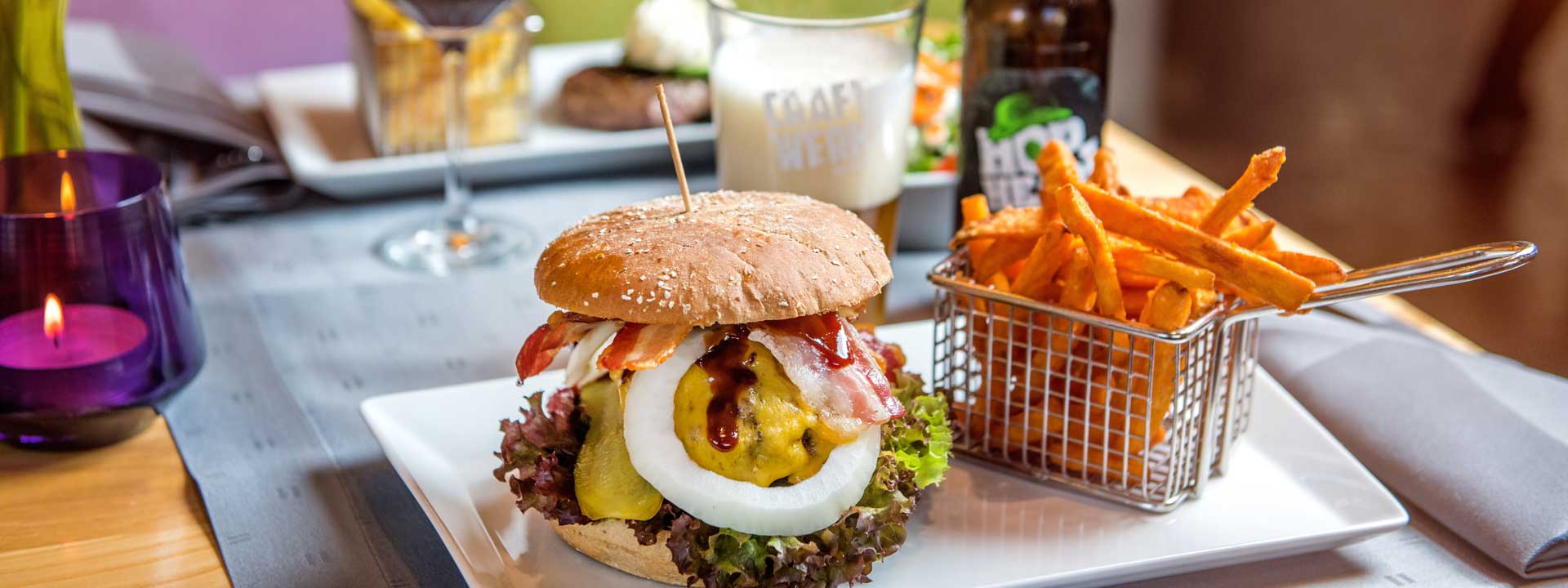 Nach einem langen, aufregenden Tag mit tollen Aktivitäten in der Moselregion gibt es nichts Besseres als ein deftiges Menü. Die Fleischspezialitäten und Burger in unserem Restaurant in Cochem sind in der ganzen Stadt beliebt. Vom Wiener Schnitzel über kreative Burgerkreationen, die natürlich auch vegan zubereitet werden können, bis hin zu mediterranen oder französischen Spezialitäten wie Flammkuchen bieten wir Euch eine kulinarische Reise durch ganz Europa. Im Sinne der Nachhaltigkeit stammen unsere Produkte jedoch hier aus der Region: Im „Das Meyers“ genießt Ihr zum Beispiel Eier vom Thomashof Faid, Geflügel vom Geflügelhof Jansen und Burgerfleisch mit „Eifel“-Siegel. Wie wäre es mit einer hausgemachten Limonade oder einem Craft Beer dazu?